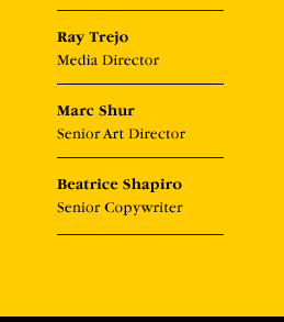 Beatrice has been writing and producing advertising for more than 20 years, working on accounts of every size and description. She has developed campaigns for clients such as Avery Dennison, Del Taco, Farmer John, Guitar Center, Safeway, Sears, Service Merchandise, Shakey’s Pizza, Smart & Final, Thai Airways, True Value Hardware Stores and Zacky Farms. Most notable of these was “PC Modem & Bob” for CompUSA. |